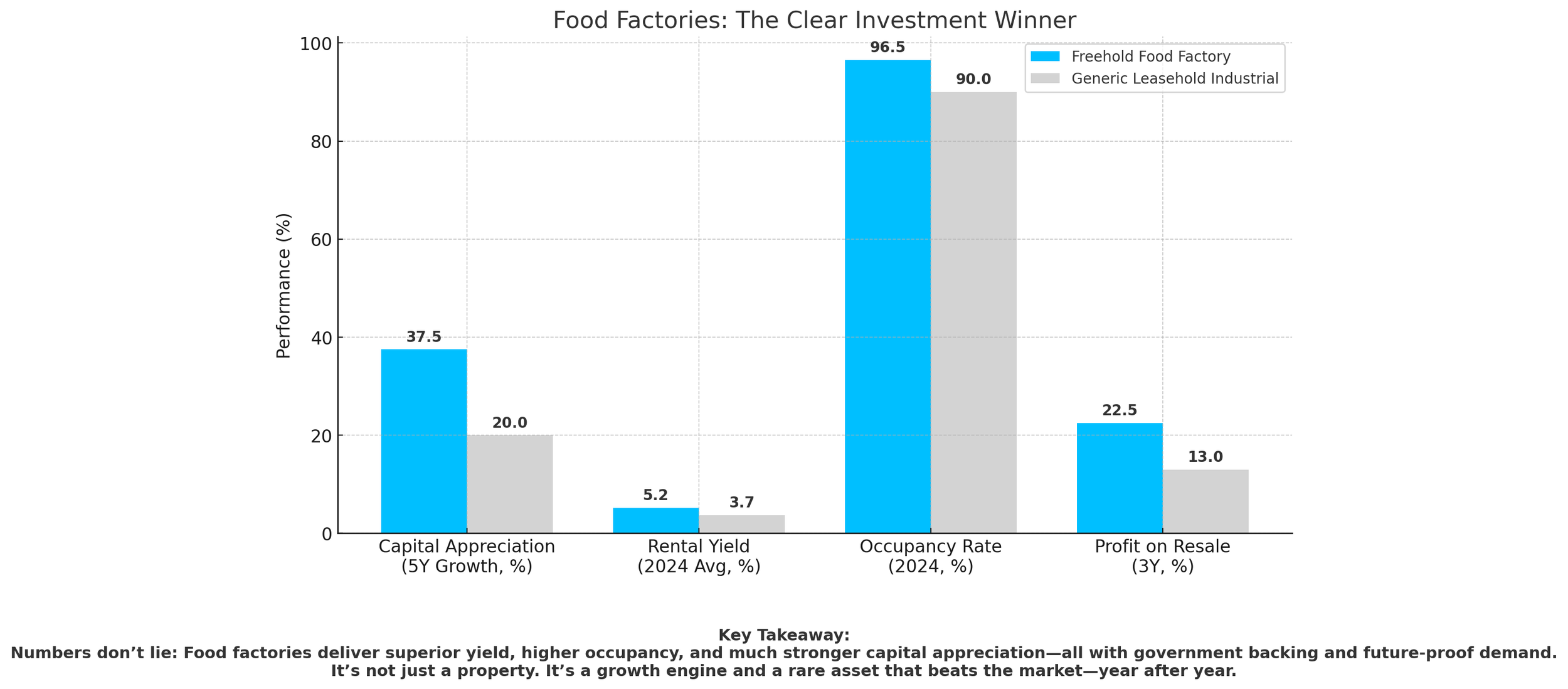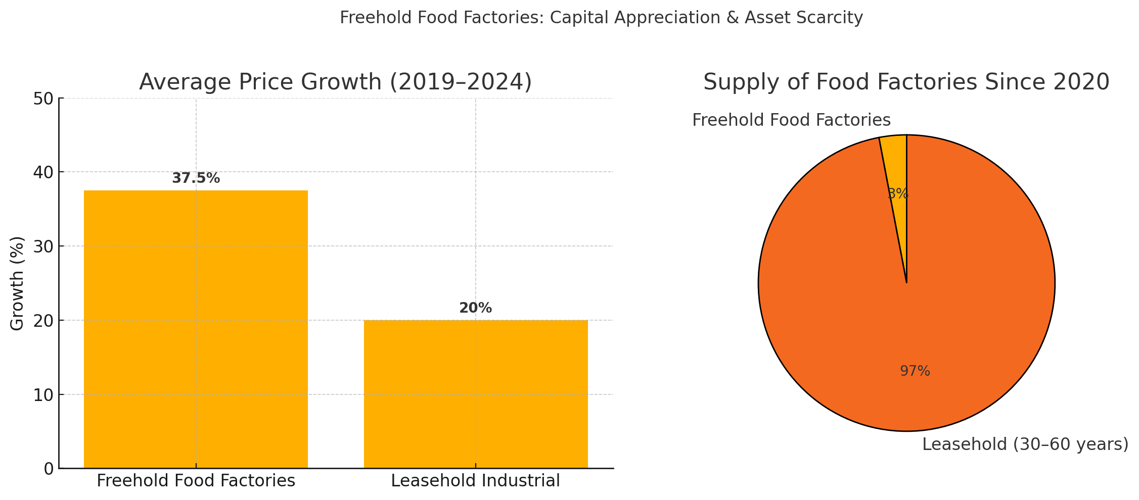 Average freehold food factory values have increased by 30–45% (2019–2024), compared to 15–25% for standard 60-year leasehold industrial units.Supply Rarity:
